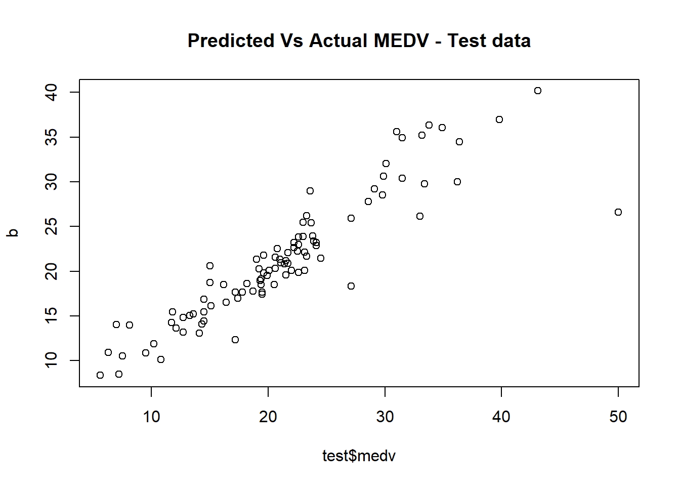 plot(b~ test$medv, main = 'Predicted Vs Actual MEDV - Test data')