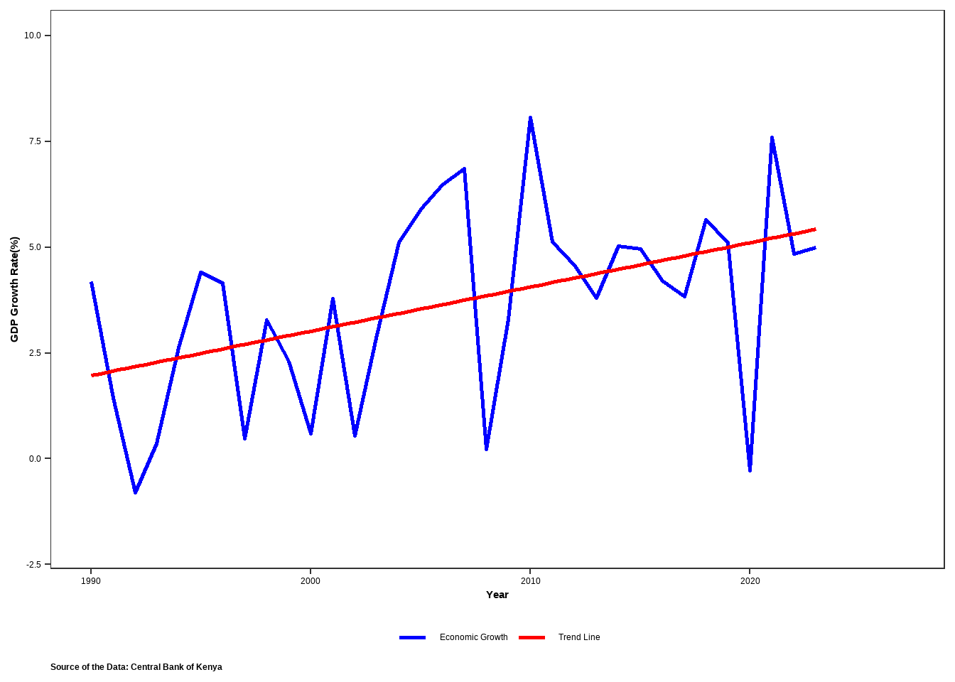 Initially, in the early 1990s, the economy appeared relatively stable, with modest fluctuations in growth rates. However, as the years progress, there are noticeable shifts in economic growth patterns. For instance, in the mid to late 1990s, there seems to be a period of sustained growth, as indicated by consistently positive growth rates. during this time, Kenya underwent significant economic reforms, including liberalization policies that aimed to open up the economy, attract foreign investment, and stimulate private sector growth. These reforms, initiated in the early 1990s, helped create a more conducive environment for business and investment, fostering economic expansion. Towards the later years of the observed period, economic growth becomes more variable, with both positive and negative growth rates recorded. These fluctuations in economic growth highlight the inherent volatility and complexity of Kenya’s economy, influenced by both domestic and international factors. Understanding these trends is one of the motivations for this study