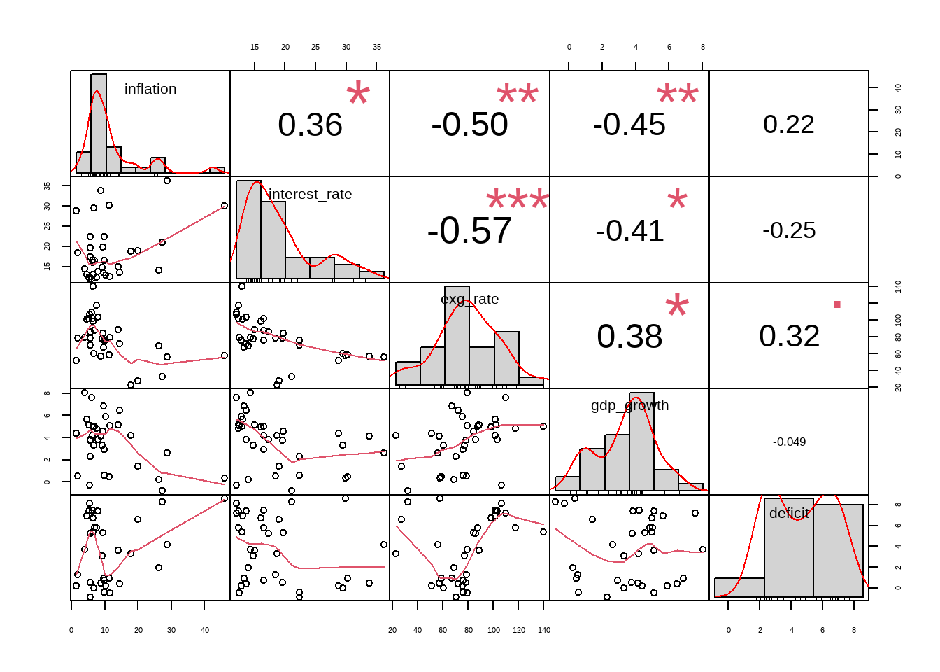 correlation measures the strength and direction of the linear relationship between two variables. The values range from -1 to 1. A correlation coefficient close to 1 indicates a strong positive linear relationship while a correlation coefficient close to -1 indicates a strong negative linear relationship. A correlation coefficient close to 0 indicates a weak or no linear relationship between the variables. Higher real interest rates are associated with lower GDP growth rates, correlation (-0.55) which is statistically significant.Higher interest rate can lead to reduced consumer and business spending, as borrowing cost increases. This reduction slows down economic growth. There is a moderate positive correlation (0.41) between GDP growth rate and exchange rate, and it is statistically significant. This suggests that a stronger exchange rate (depreciation) is associated with higher GDP growth rates. a higher exchange rate(domestic currency depreciation) can make country’s export more competitive in international market which leads to increase in export volumes, boosting economic growth. There is a negative correlation (-0.70) between interest rate and exchange rates indicating a strong inverse relationship between the two variables. This implies that periods of domestic currency depreciation(higher exchange rates) are strongly associated with periods of lower interest rate. Also a significant moderate inverse correlation(-0.53) exists between inflation and exchange rate. This indicates that higher exchange rate (weaker domestic currency) is asscociated with lower inflation and lower exchange rate(stronger domestic currency) is associated with higher inflation this is less common in most economics and kenya economics may be unique. Budget deficit has a positive moderate correlation(0.41) with exchange rates. this means that as the budget deficit increases the exchange rate also tends to increase.An increase in exchange rate implies depreciation of the domestic currency thus a positive correlation suggest that higher budget deficit are associated with weaker domestic currency.