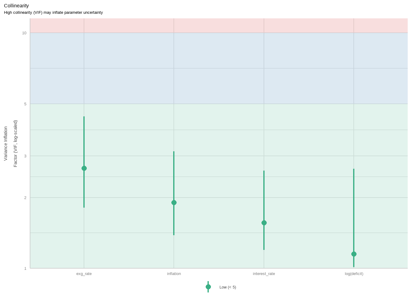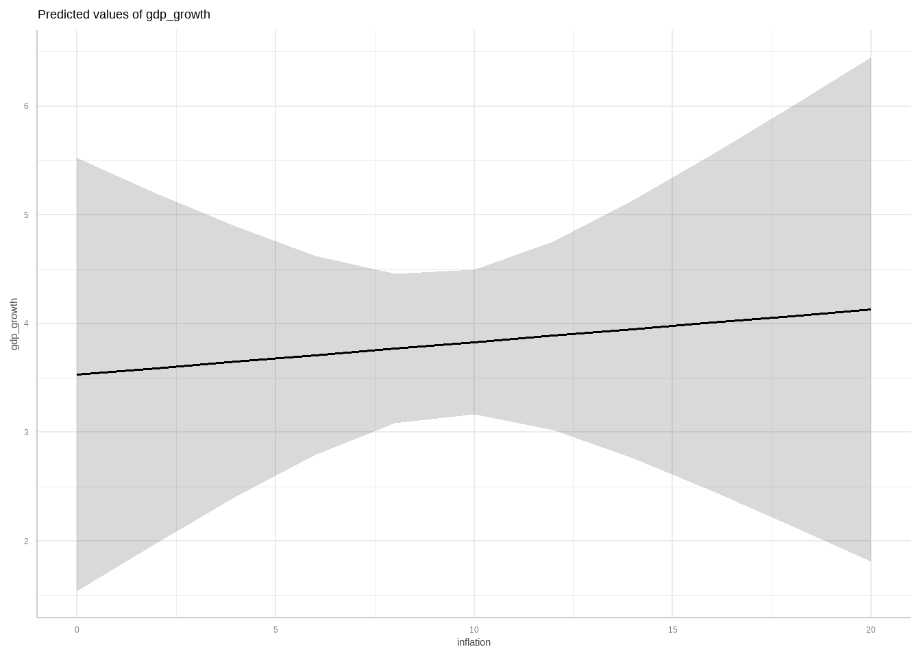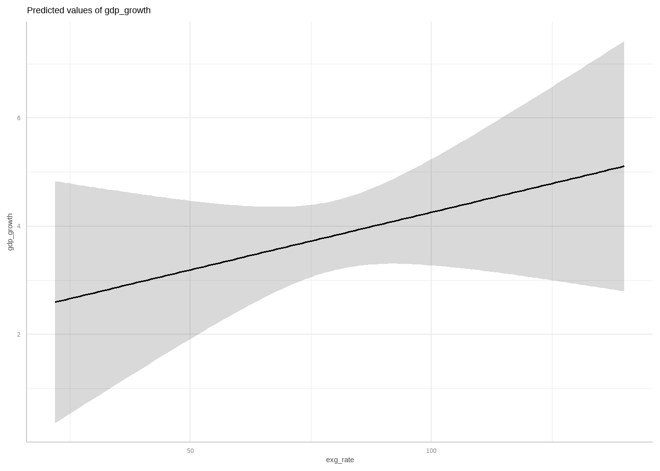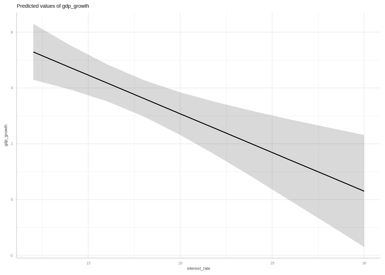 The impact of each predictor variable on GDP was assessed using ggeffects, a package in R specifically designed for calculating marginal effects and predictions from statistical models. ggeffects was employed to estimate and visualize the predicted values of GDP based on changes in each predictor variable while holding other variables constant. This approach allowed for a detailed examination of how inflation, real interest rates, exchange rates, and the log of deficit individually influence GDP growth in the regression model.