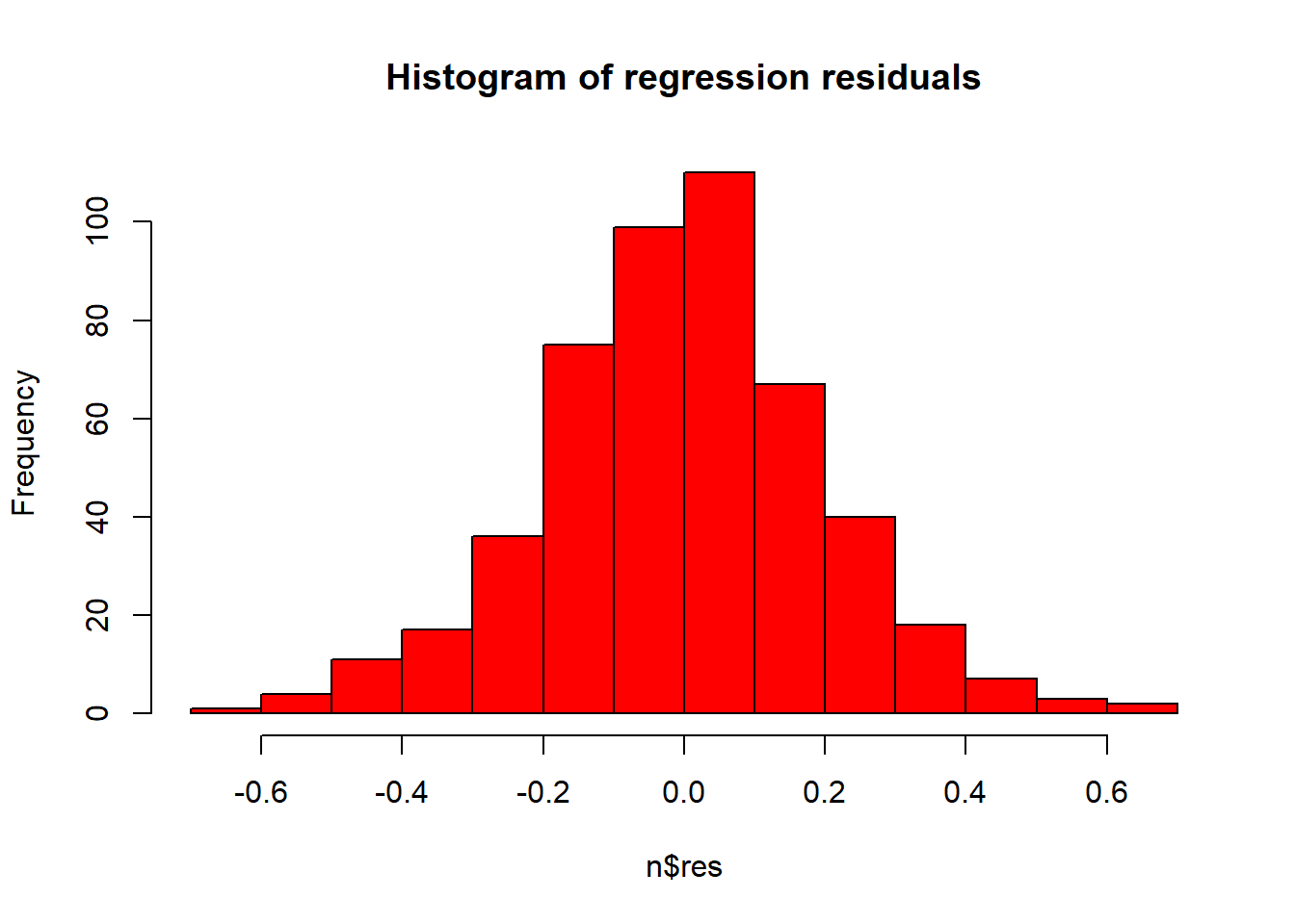 hist(n$res, col = "red", main = "Histogram of regression residuals")