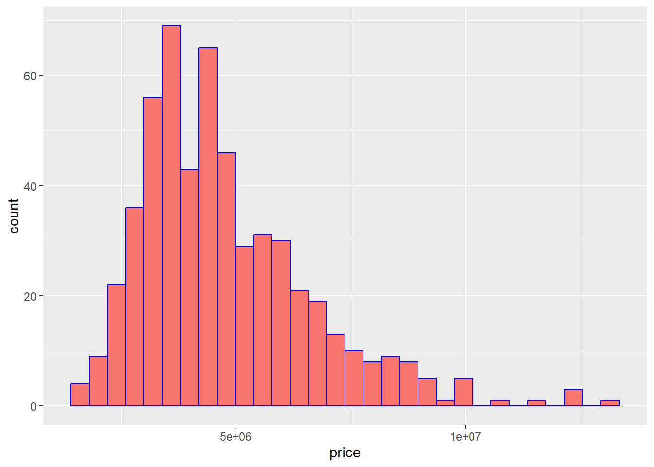 house %>% ggplot(aes(price, fill = "red"))+geom_histogram(color = "blue")+theme(