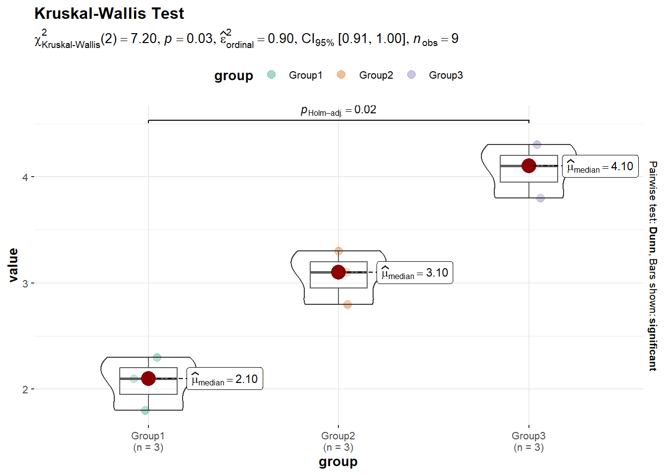 library(FSA)# Perform post hoc pairwise comparisons using the Dunn testdunn_test_result<-dunnTest(value~group, data =data, method ="holm")print(dunn_test_result)