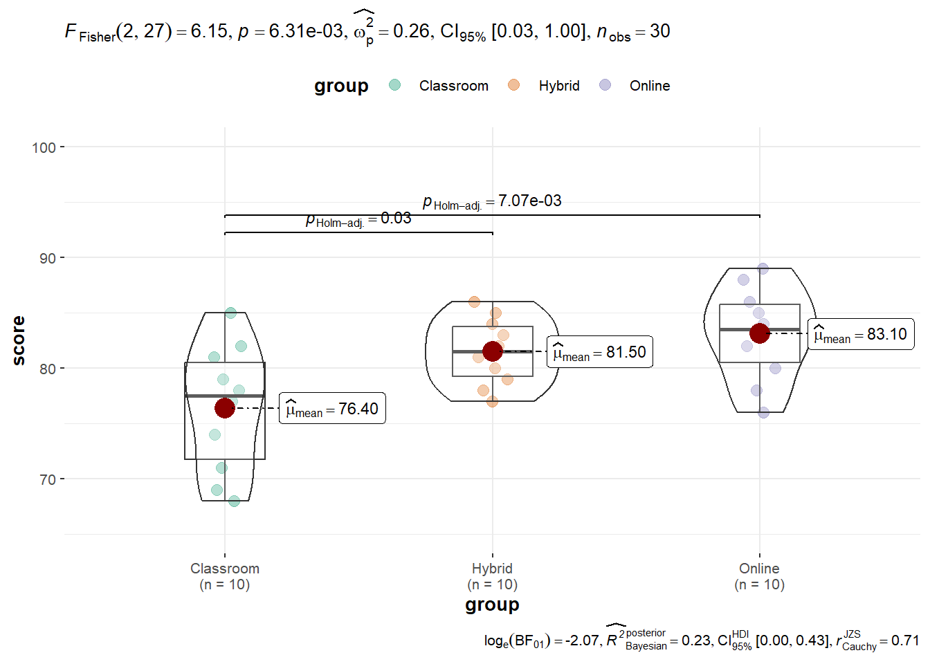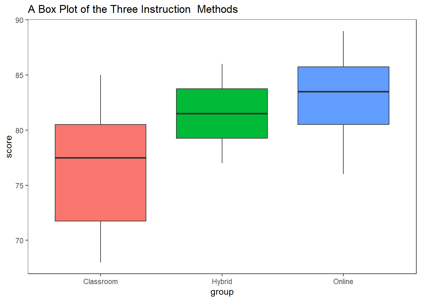 Let’s go through a practical example to understand how to perform a one-way ANOVA in R. Suppose we have three groups of students who received different types of instruction (Classroom, Online, Hybrid), and we want to test if there is a significant difference in their test scores.