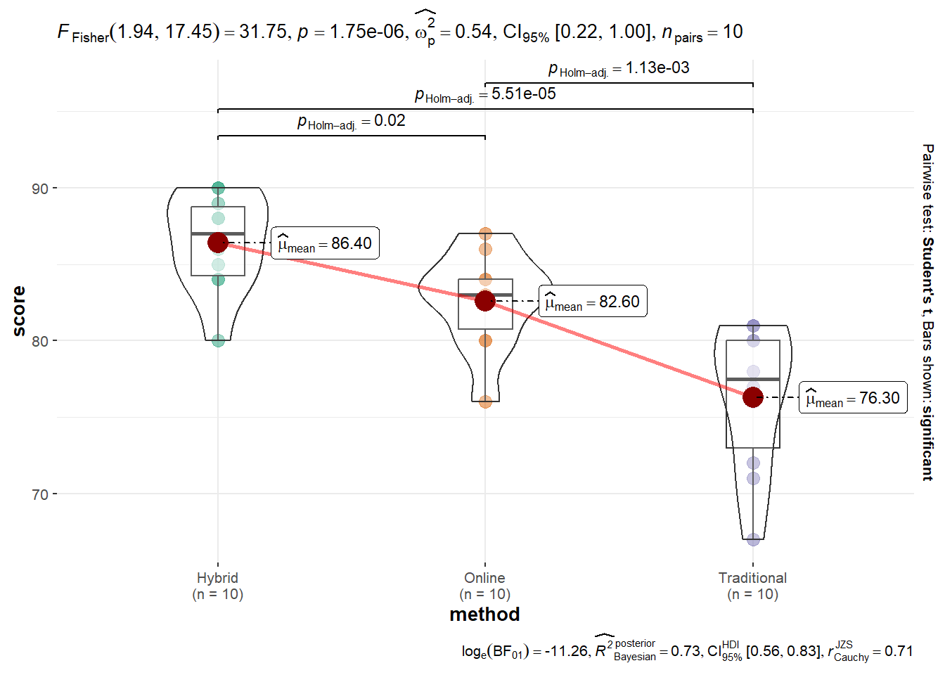 library(tidyverse)# data manipulationlibrary(ggstatsplot)# visualizing and conducting statistical testslibrary(car)#homogenity of variancelibrary(rstatix)#Perform the Repeated Measures ANOVA library(effectsize)# Sample data: students' scoresdata<-data.frame( subject =factor(rep(1:10, each =3)), method =factor(rep(c("Traditional", "Online", "Hybrid"), times =10)), score =c(67, 80, 84, 71, 76, 85, 77, 83, 90, 81, 84, 88, 76, 80, 89, 80, 83, 86, 81, 83, 88, 72, 84, 80, 78, 87, 84, 80, 86, 90))
