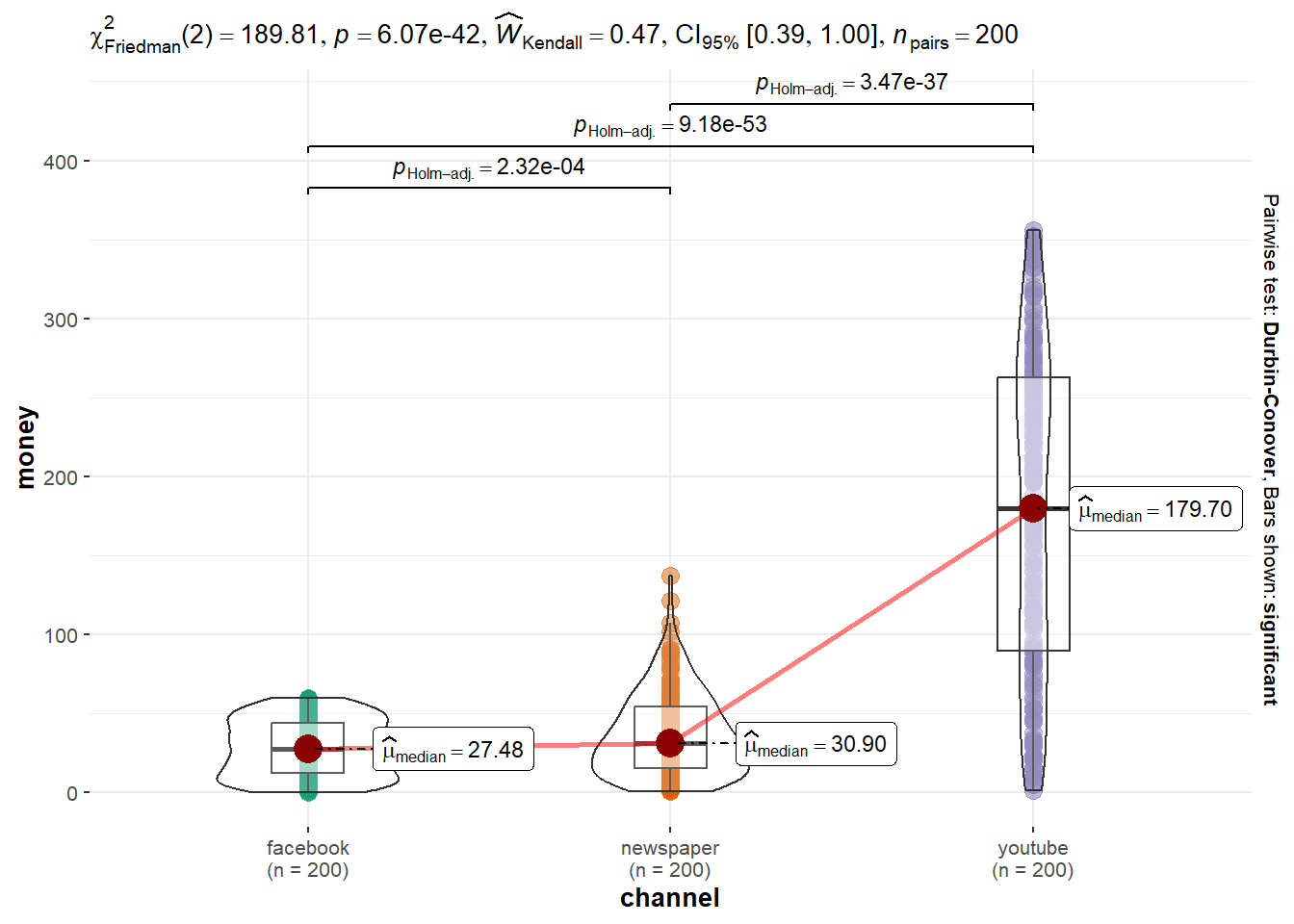 ggwithinstats( data =data, x =channel, y =money, type ="np")