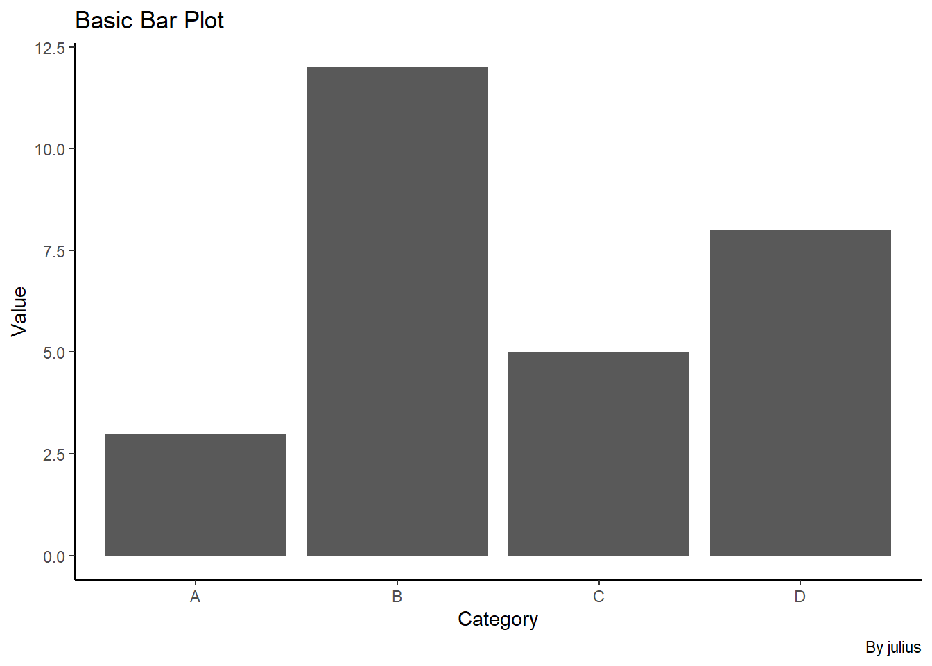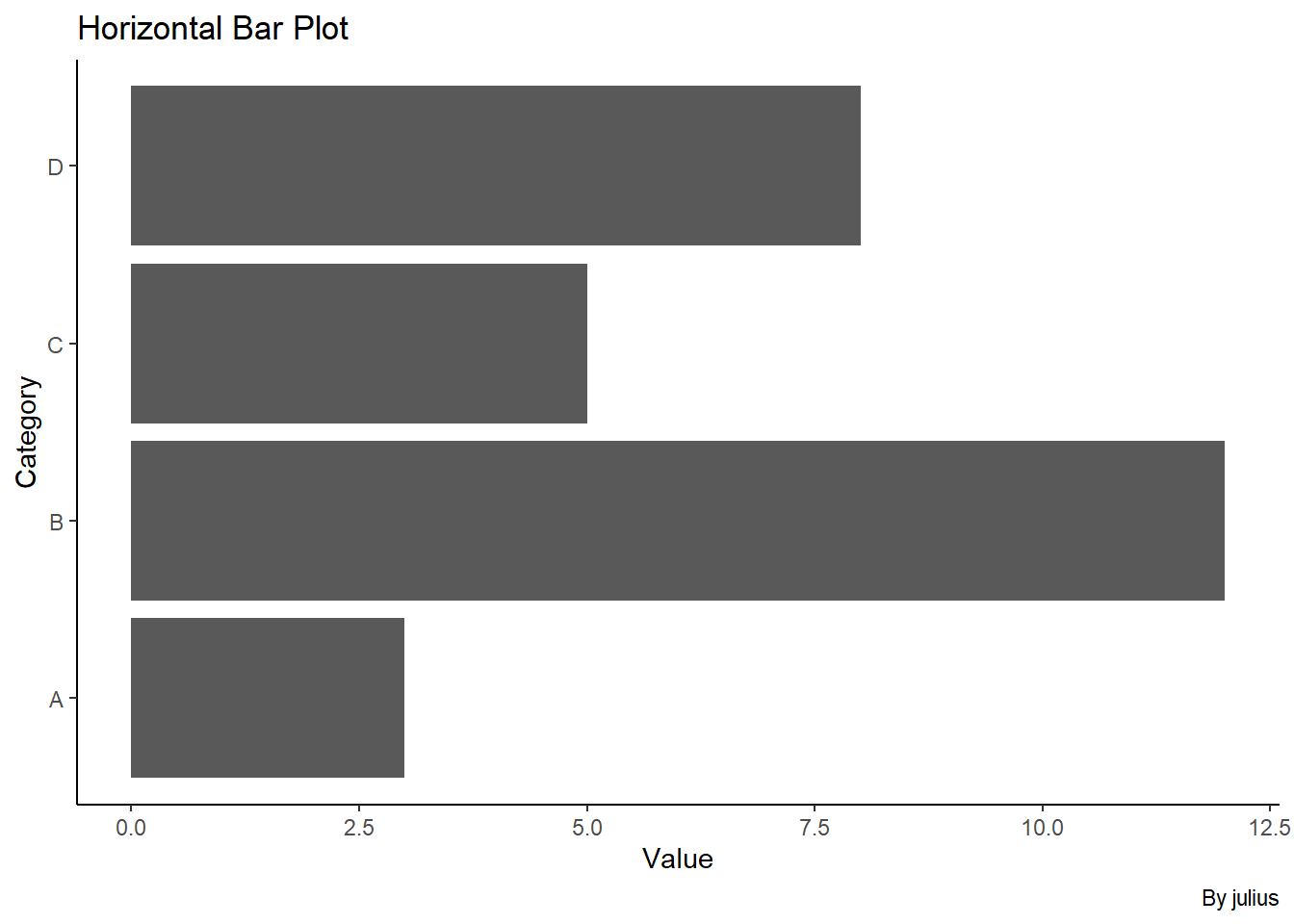 # Create a horizontal bar plotggplot(data, aes(x =Value, y =Category))+geom_bar(stat ="identity")+labs(title ="Horizontal Bar Plot", x ="Value", y ="Category", caption ="By julius")
