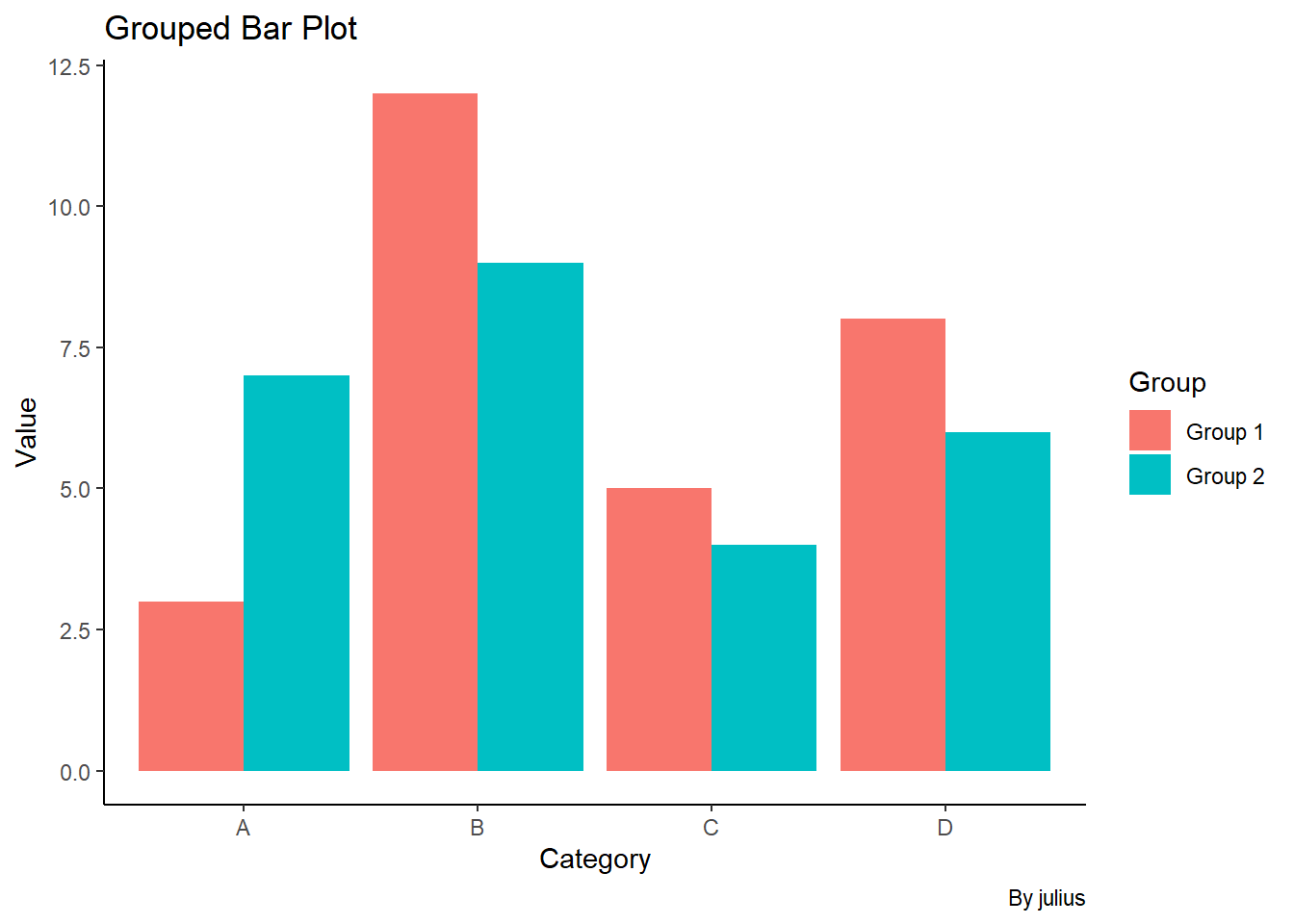 # Create a sample dataset with groupsdata2<-data.frame( Category =rep(c("A", "B", "C", "D"), 2), Value =c(3, 12, 5, 8, 7, 9, 4, 6), Group =rep(c("Group 1", "Group 2"), each =4))# Create a grouped bar plotggplot(data2, aes(x =Category, y =Value, fill =Group))+geom_bar(stat ="identity", position ="dodge")+labs(title ="Grouped Bar Plot", x ="Category", y ="Value", fill ="Group", caption ="By julius")