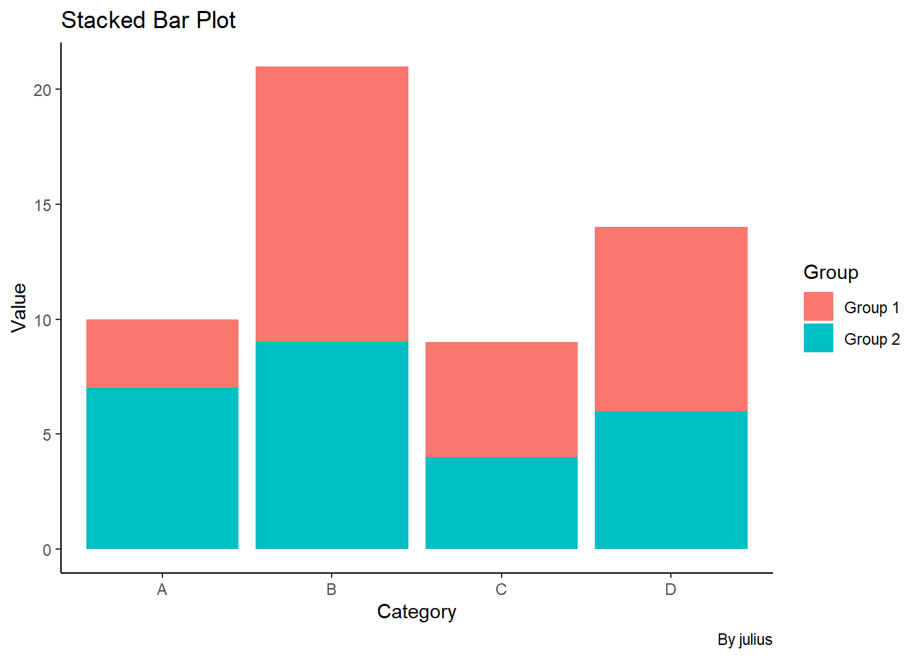 # Create a stacked bar plotggplot(data2, aes(x =Category, y =Value, fill =Group))+geom_bar(stat ="identity")+labs(title ="Stacked Bar Plot", x ="Category", y ="Value", fill ="Group", caption ="By julius")