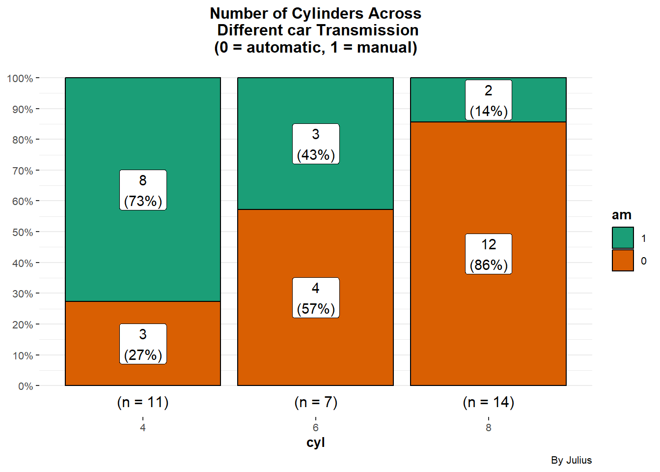 library(ggstatsplot)ggbarstats( data =mtcars, x =am, y =cyl, label ="both", results.subtitle =FALSE)+labs(title ="Number of Cylinders Across\n Different car Transmission\n(0 = automatic, 1 = manual)")+theme(plot.title =element_text(hjust =0.5))+labs(caption ="By Julius")