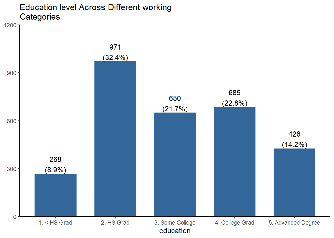 Wage%>%plot_frq(education, title ="Education level Across Different working Categories")