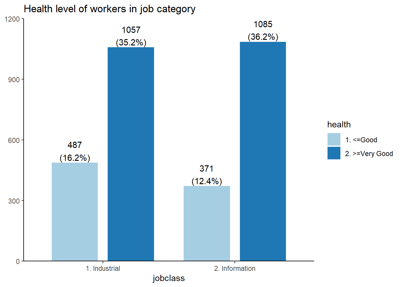 plot_grpfrq(Wage$jobclass, Wage$health, title ="Health level of workers in job category")