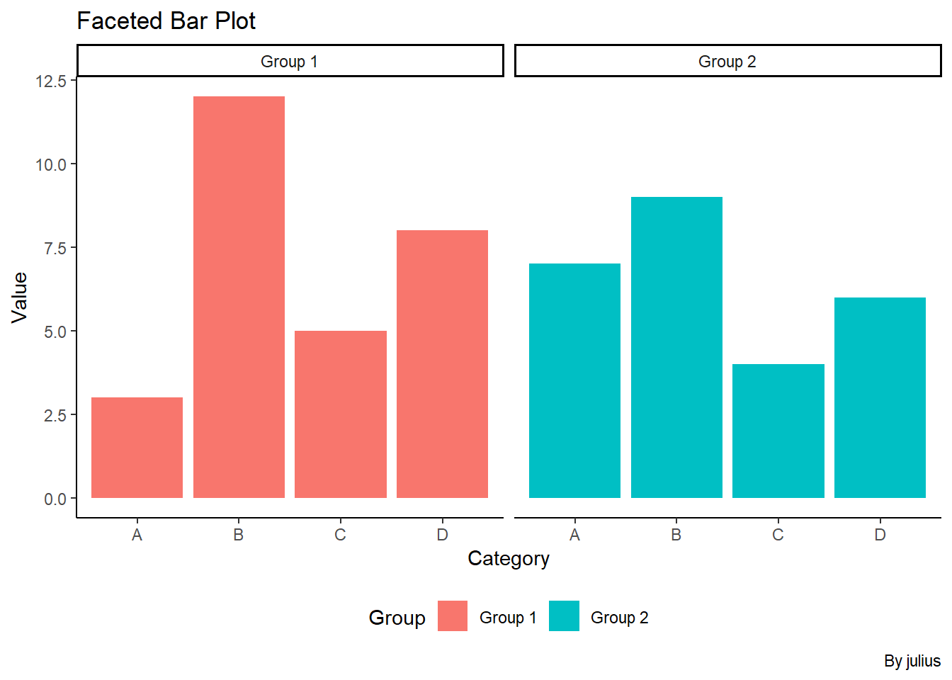 # Create a faceted bar plotggplot(data2, aes(x =Category, y =Value, fill =Group))+geom_bar(stat ="identity")+facet_wrap(~Group)+labs(title ="Faceted Bar Plot", x ="Category", y ="Value", fill ="Group", caption ="By julius")+theme(legend.position ="bottom")