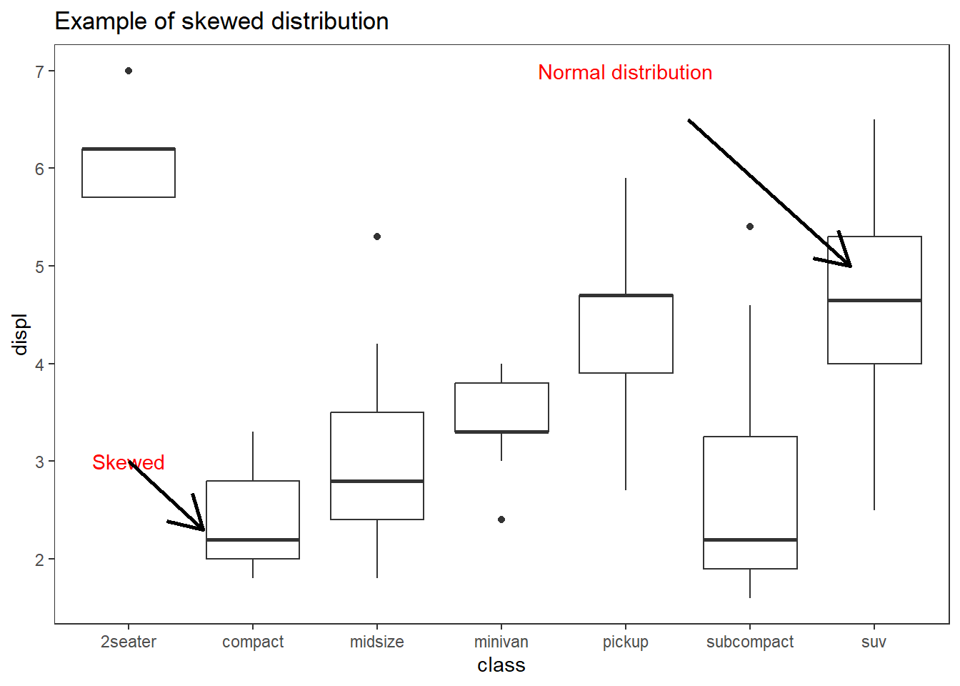 ggplot(mpg, aes(x = class, y = displ))+geom_boxplot()+annotate("text",x = 1,y = 3, label = "Skewed", color = "red")+ geom_segment(