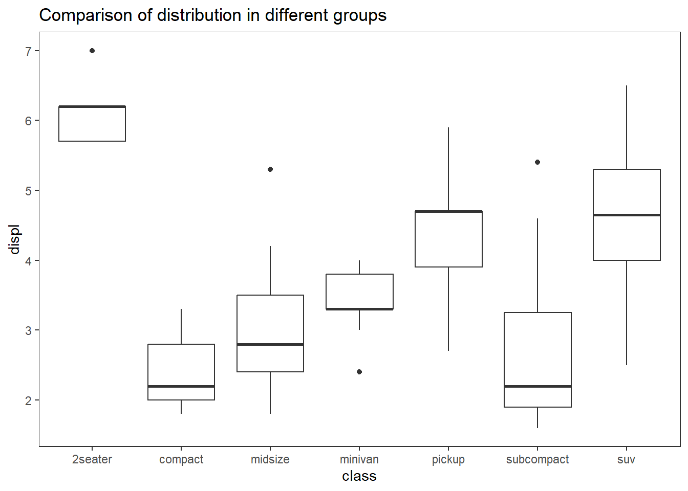 ggplot(mpg, aes(x = class, y = displ))+geom_boxplot()+labs(title = "Comparison of distribution in different groups")