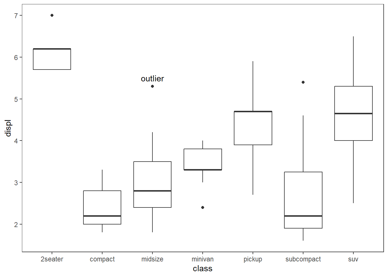 ggplot(mpg, aes(x = class, y = displ))+geom_boxplot()+annotate("text",x = 3,y = 5.5, label = "outlier")