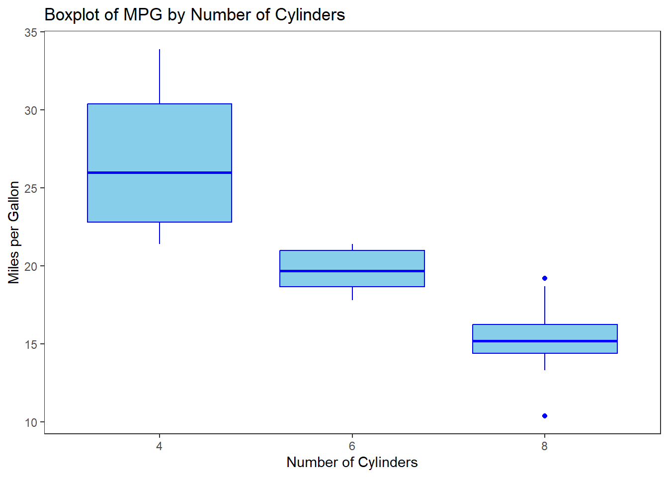 labs(title = "Boxplot of MPG by Number of Cylinders",