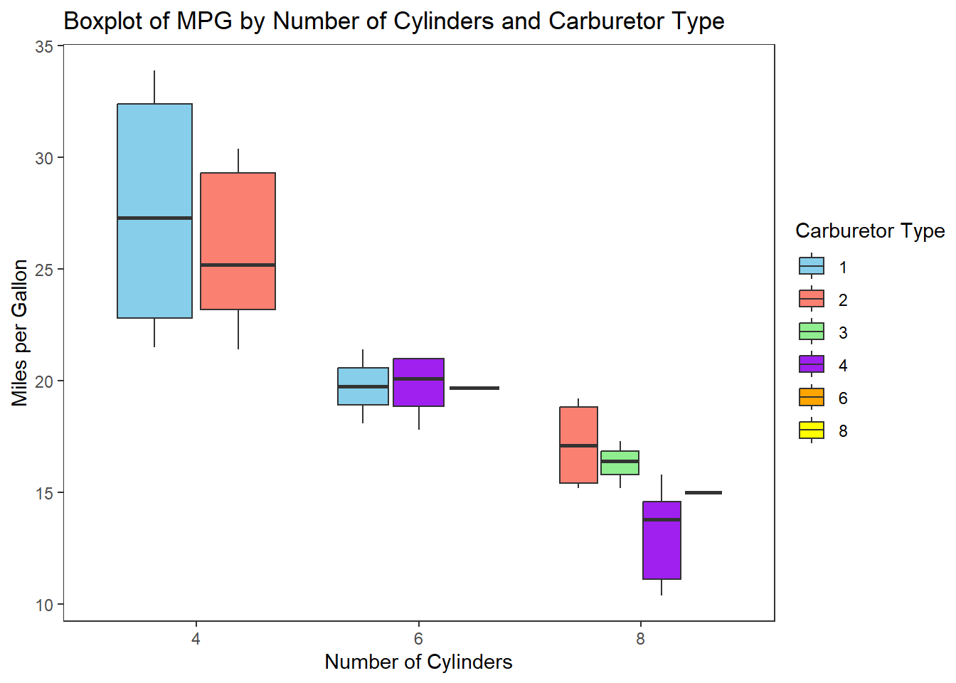 labs(title = "Boxplot of MPG by Number of Cylinders and Carburetor Type",