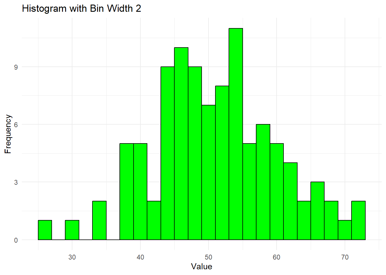 geom_histogram(binwidth = 2, fill = "green", color = "black") +