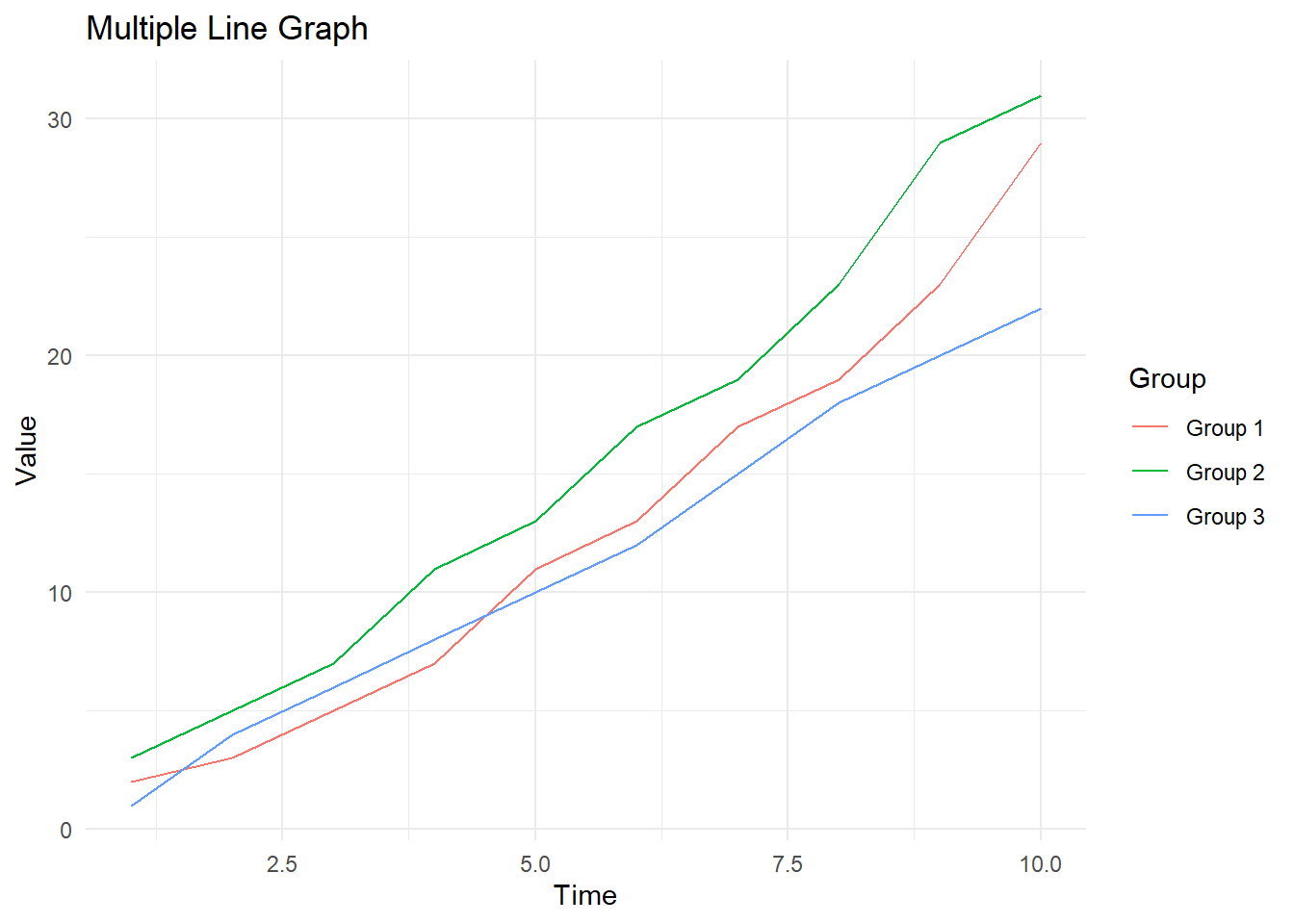 # Create a sample dataset with multiple groupsdata2<-data.frame( Time =rep(1:10, 3), Value =c(2, 3, 5, 7, 11, 13, 17, 19, 23, 29,3, 5, 7, 11, 13, 17, 19, 23, 29, 31,1, 4, 6, 8, 10, 12, 15, 18, 20, 22), Group =rep(c("Group 1", "Group 2", "Group 3"), each =10))# Create a multiple line graphggplot(data2, aes(x =Time, y =Value, color =Group))+geom_line()+labs(title ="Multiple Line Graph", x ="Time", y ="Value", color ="Group")+theme_minimal()