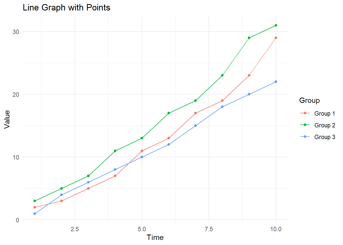 # Create a line graph with pointsggplot(data2, aes(x =Time, y =Value, color =Group))+geom_line()+geom_point()+labs(title ="Line Graph with Points", x ="Time", y ="Value", color ="Group")+theme_minimal()