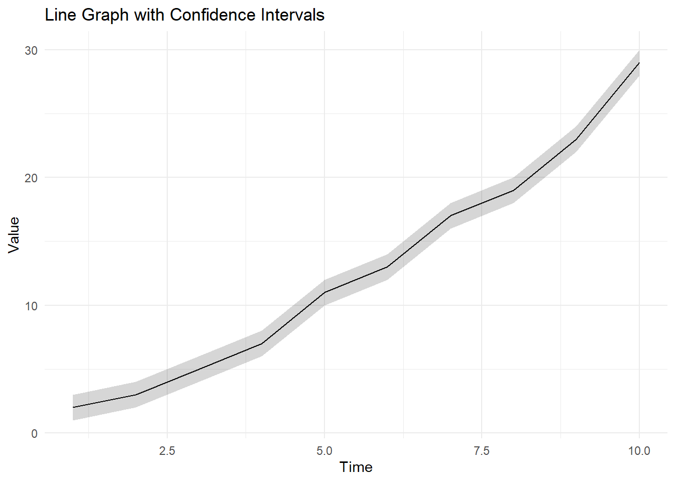# Create a sample dataset with confidence intervalsdata3<-data.frame( Time =1:10, Value =c(2, 3, 5, 7, 11, 13, 17, 19, 23, 29), Lower =c(1, 2, 4, 6, 10, 12, 16, 18, 22, 28), Upper =c(3, 4, 6, 8, 12, 14, 18, 20, 24, 30))# Create a line graph with confidence intervalsggplot(data3, aes(x =Time, y =Value))+geom_line()+geom_ribbon(aes(ymin =Lower, ymax =Upper), alpha =0.2)+labs(title ="Line Graph with Confidence Intervals", x ="Time", y ="Value")+theme_minimal()