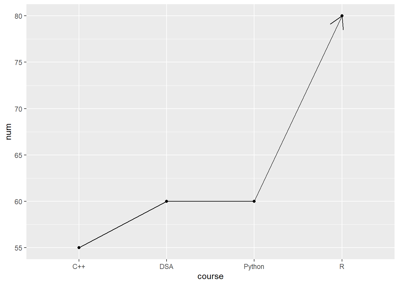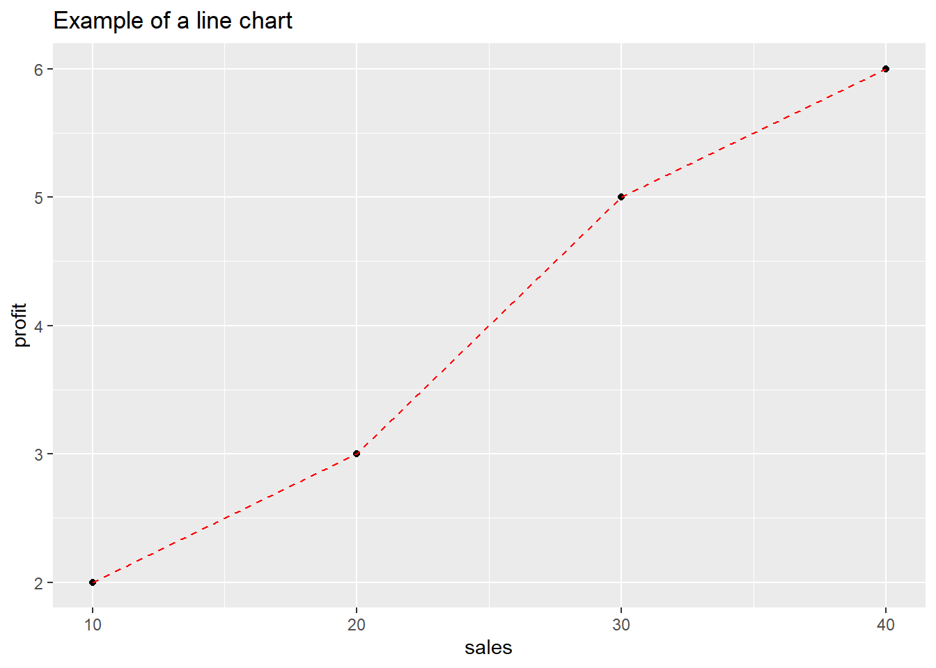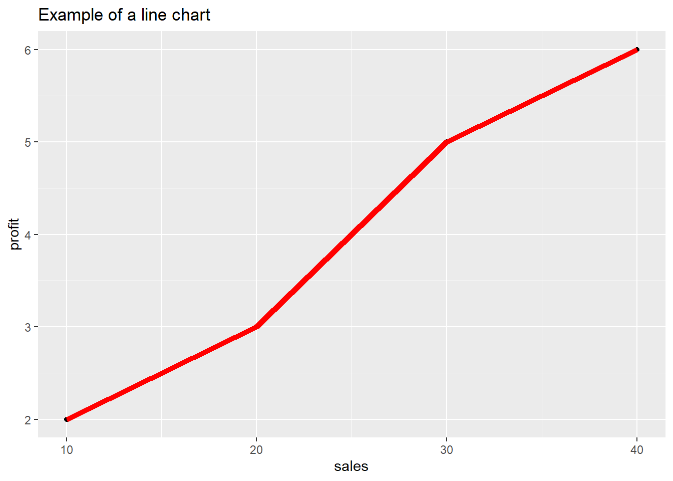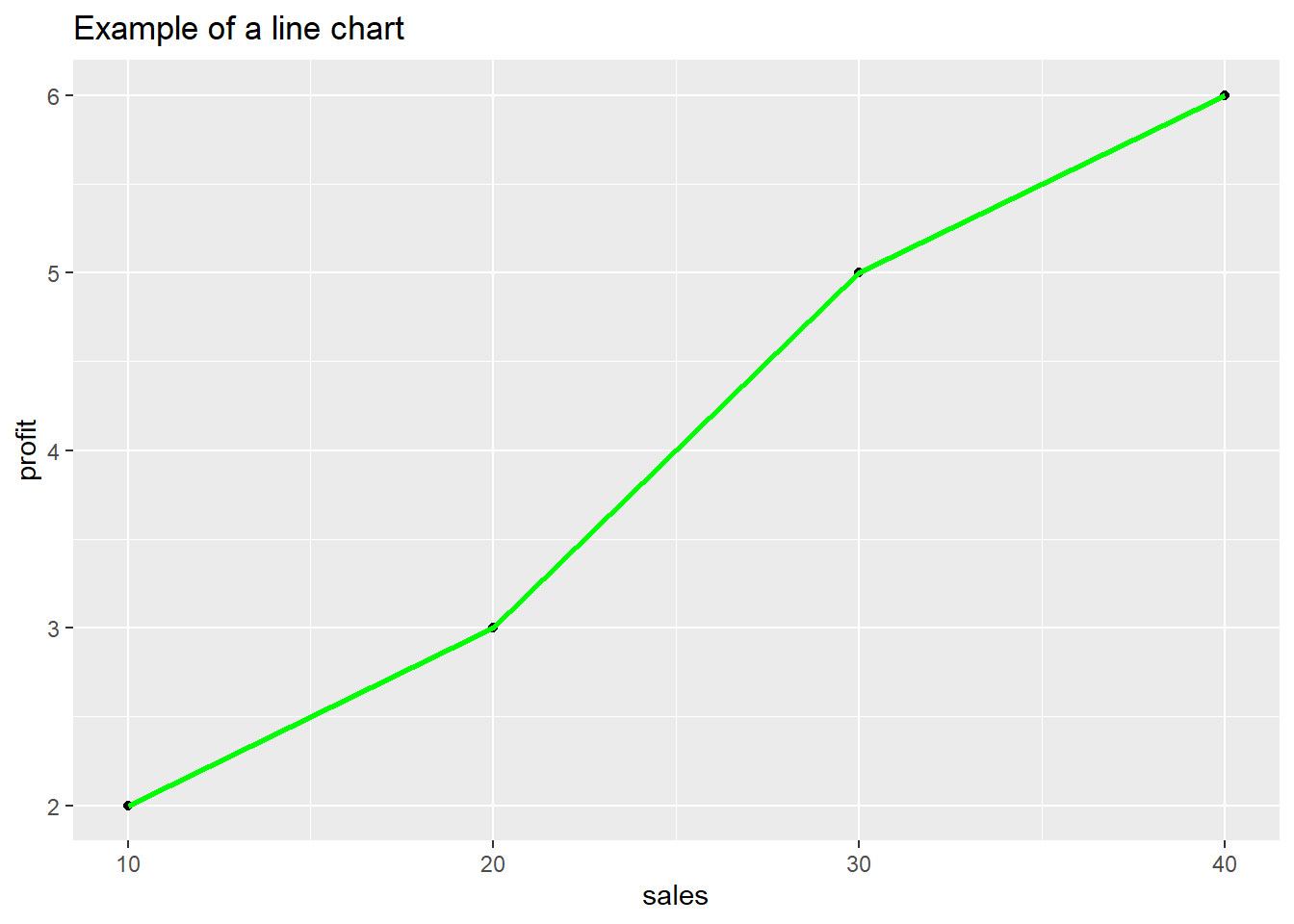 sales<-c(10,20,30,40)profit<-c(2,3,5,6)df<-tibble(sales,profit)df%>%ggplot(aes(sales,profit))+geom_point()+geom_line(color ="green", linewidth =1, size =3)+labs(title ="Example of a line chart")