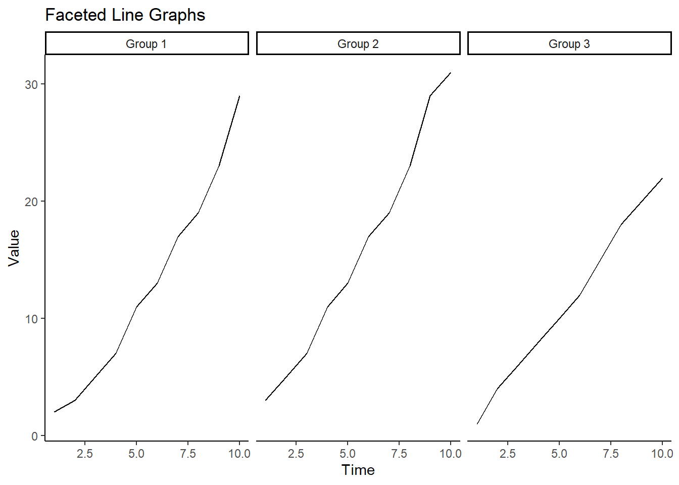 # Create a sample dataset with multiple groupsd4<-data.frame( Time =rep(1:10, 3), Value =c(2, 3, 5, 7, 11, 13, 17, 19, 23, 29,3, 5, 7, 11, 13, 17, 19, 23, 29, 31,1, 4, 6, 8, 10, 12, 15, 18, 20, 22), Group =rep(c("Group 1", "Group 2", "Group 3"), each =10))# Create a faceted line graphggplot(d4, aes(x =Time, y =Value))+geom_line()+facet_wrap(~Group)+labs(title ="Faceted Line Graphs", x ="Time", y ="Value")+theme_classic()